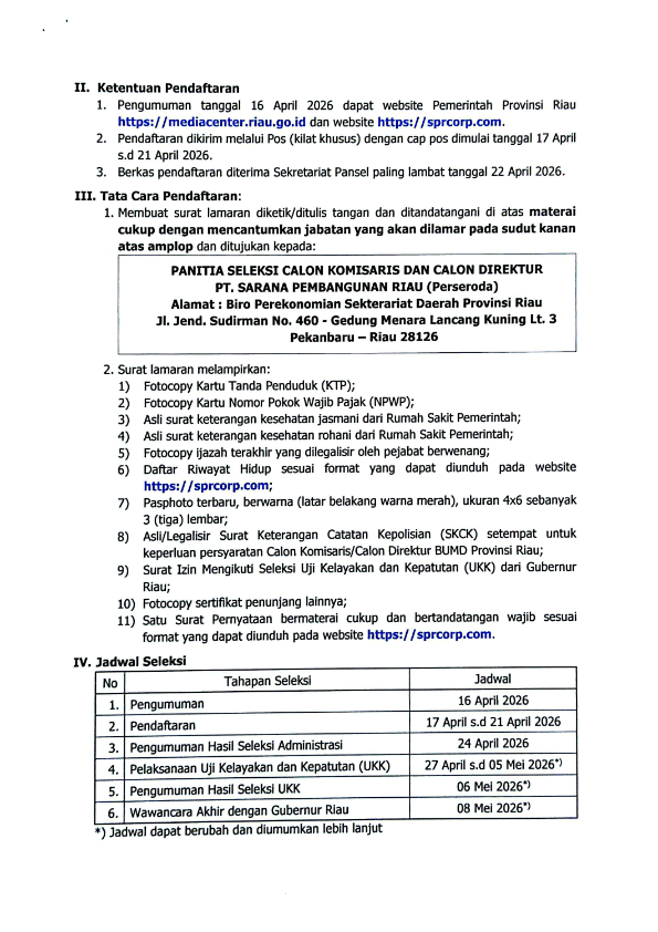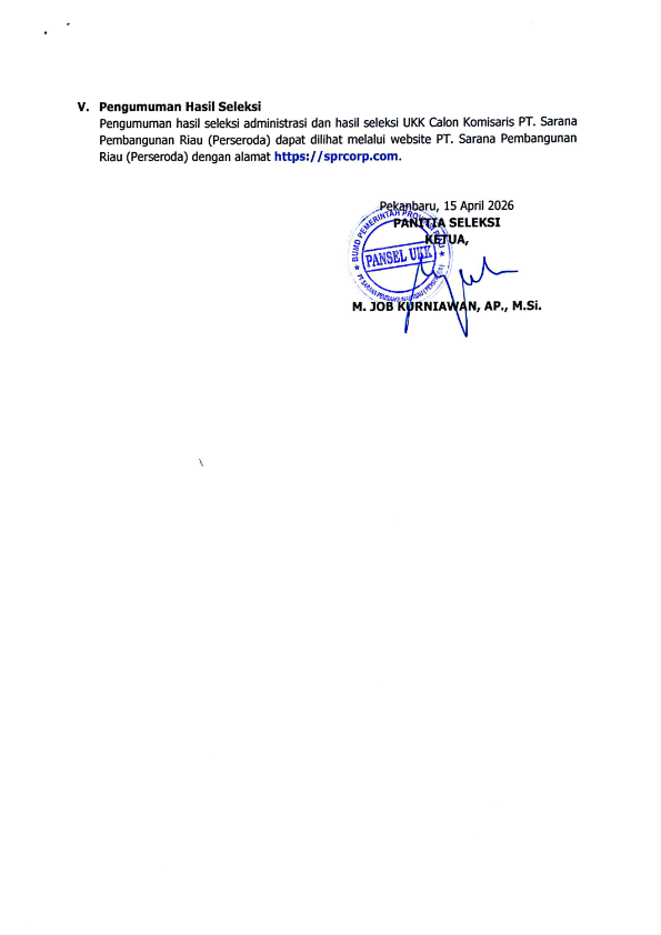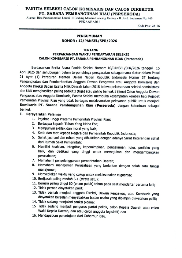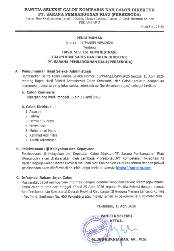 HASIL SELEKSI ADMINISTRASI CALON KOMISARIS DAN DIREKTUR PT. SARANA PEMBANGUNAN RIAU PERSERODA