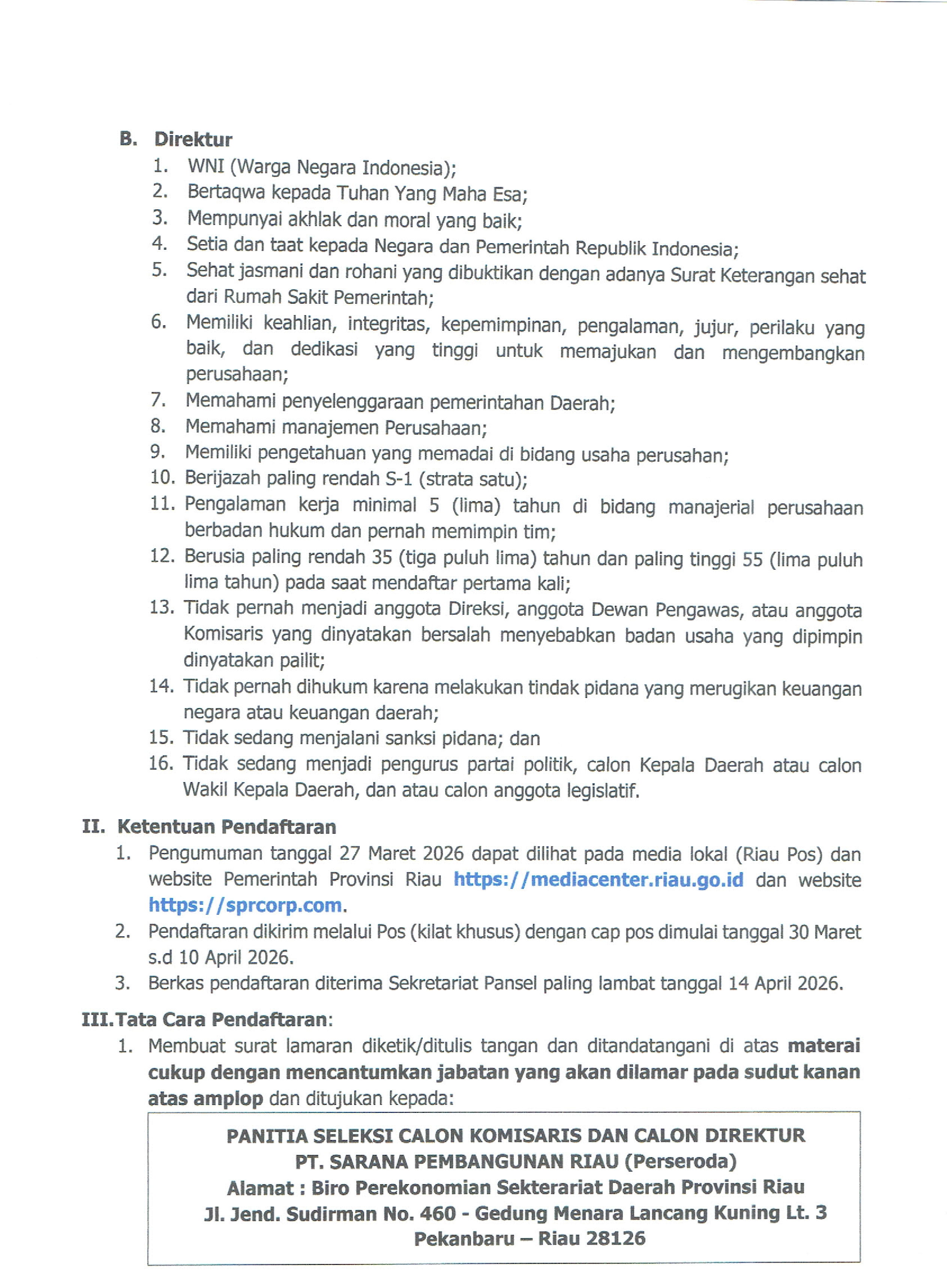 HASIL SELEKSI ADMINISTRASI CALON KOMISARIS DAN DIREKTUR PT. SARANA PEMBANGUNAN RIAU PERSERODA Pengumuman Seleksi Direktur dan Komisaris PT.Sarana Pembangunan Riau Persoalan Hukum PT SPR dan KCL Selesai Tanpa Merugikan BUMD Riau PEKANBARU – PT Sarana Pembangunan Riau (PT SPR) menyampaikan bahwa seluruh persoalan hukum dengan PT Kingswood Capital Limited (KCL)... << First < Prev 1 2 3 ... 24 Next > Last >>